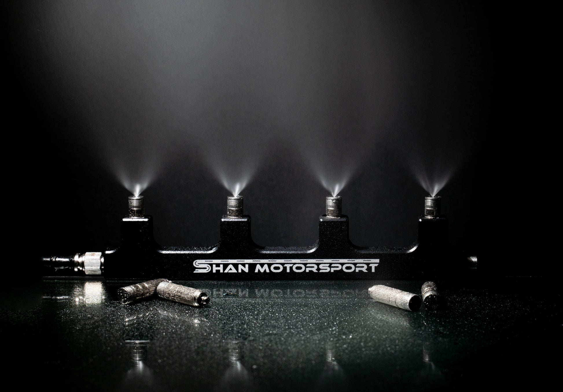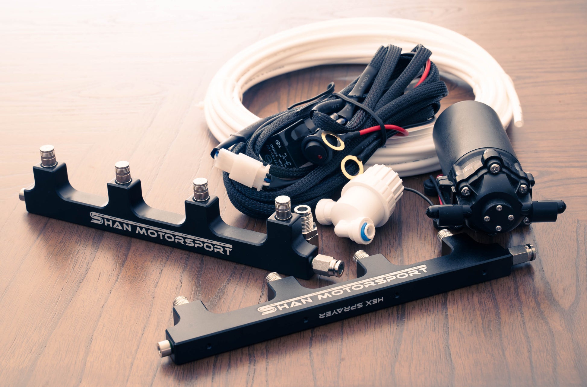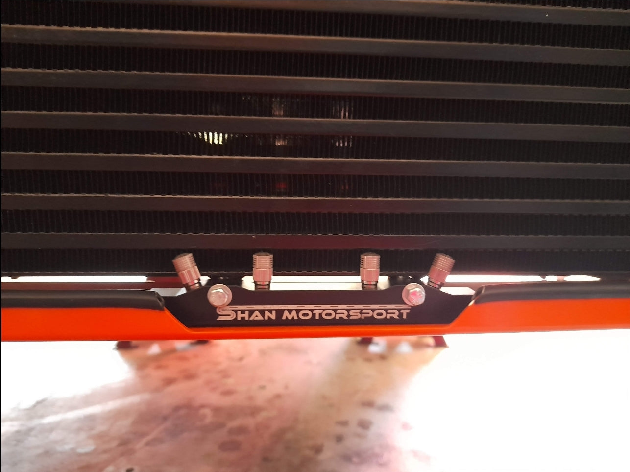 The HeX Sprayer consists of a quad nozzle water rail that when fed with a pressurised water feed, sprays a mist of water that cools the surface of an intercooler or any heat exchanger.